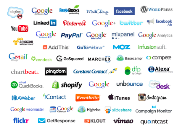 O Cyfe se destaca principalmente pela diversidade de fontes de dado com as quais a ferramenta consegue se conectar, você pode conferir algumas delas (e acredite, ainda tem muito mais) na imagem abaixo: