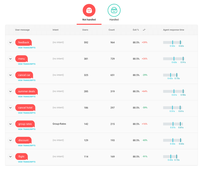 Normalmente, os desenvolvedores precisariam percorrer arquivos de log para encontrar padrões em mensagens de usuários, mas o sistema do Chatbase agrupa as mensagens dos usuários que não estão sendo manipuladas (isso ainda está disponível apenas para betatesters) e encontra oportunidades para responder a mais solicitações. Em seguida, oferece formas de otimizar o bot para ambos os problemas.