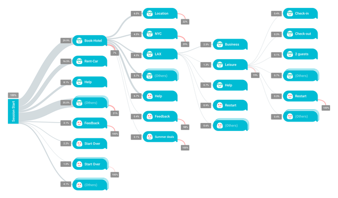 Outra capacidade notável no Chatbase é a visualização de dados do fluxo de conversão entre as sessões gerados automaticamente. Isso permite identificar o fluxo dos usuários, e onde eles geralmente saem do aplicativo. Um relatório de funil destaca estas etapas e mostra a taxa de sucesso por cada uma.