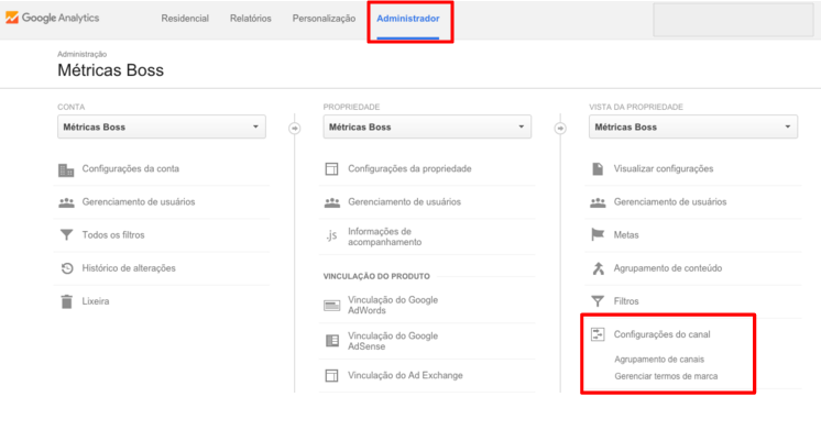 Clique em administrador no topo da tela do GA, depois clique em Configuração do Canal > Agrupamento de canais
