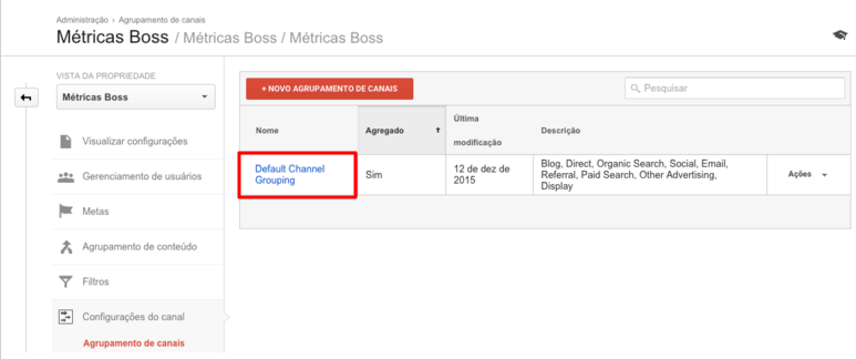 Na tela seguinte, a tela de agrupamento de canais, será exibido o único agrupamento de canais configurado, que é o criado automaticamente pelo Google Analytics. Aqui você pode optar por criar um novo agrupamento de canais (trabalho mais demorado) ou editar o já criado pelo GA (mais prático). Basta clicar direto no nome do agrupamento ou ir em ações editar.