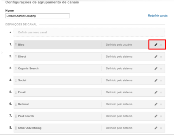 Após ter clicado para editar o agrupamento de canais, aparecerão os nomes já classificados pelo Google Analytics. Você pode editar os nomes e incluir as origens de tráfego na mesma tela. Basta clicar no lápis no canto da tela.