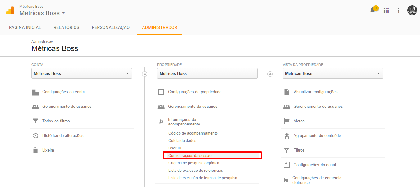 1 - Acesse a aba administrador>Propriedade>Informações de Acompanhamento>Configurações da Sessão