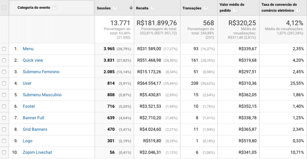 Este relatório só será exibido após você criar os eventos em seu site. Essas informações ficam dentro do relatório de comportamento>eventos.