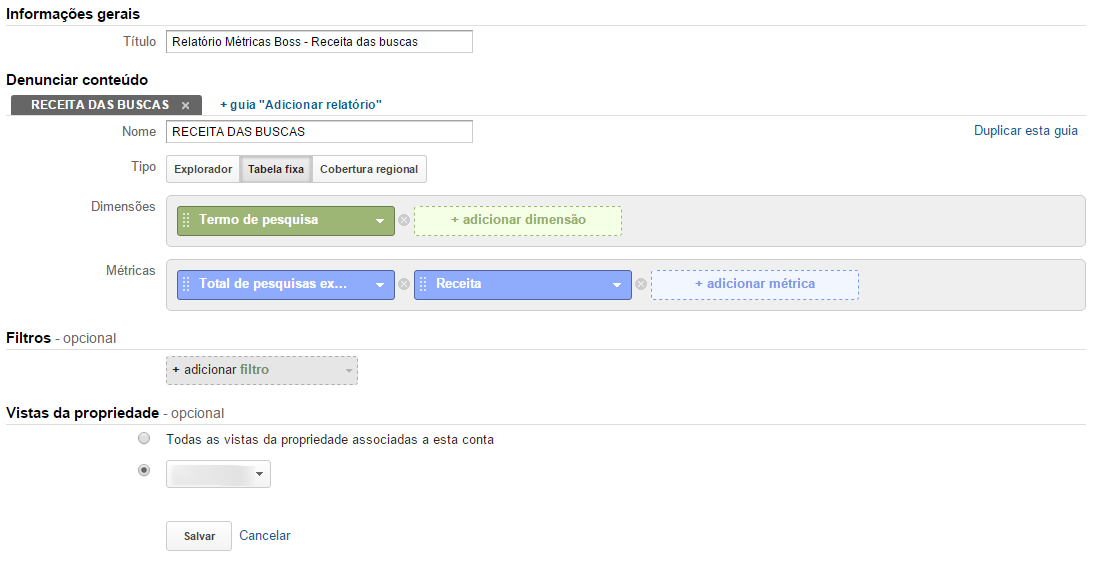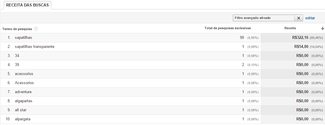 O relatório personalizado que criamos é para conseguir ver a receita das buscas do seu site e com isso você verá o relatório dessa forma: