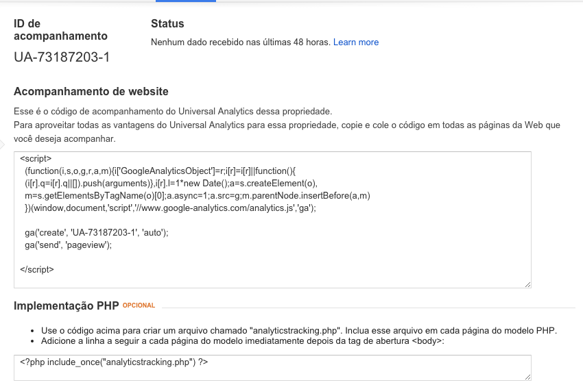 Agora é o passo final, a sua conta já esta criada, as informações do site foram inseridas com sucesso e você só precisa incluir o código exibido na tela do GA. Com esse código implementado no site você termina de criar a conta do Google Analytics.