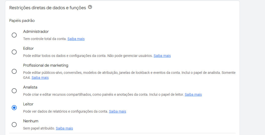 Administrador Controle total do Google Analytics. Pode gerenciar usuários (adicionar/excluir usuários, atribuir qualquer função ou restrição de dados)