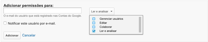 É necessário identificar o usuário através do email e também é preciso que seja um email do gmail ou google apps e a esse email você atribui permissões apropriadas. As Permissões do Google Analytics são divididas da seguinte maneira:
