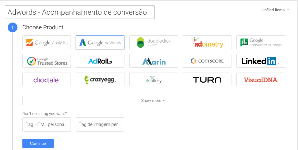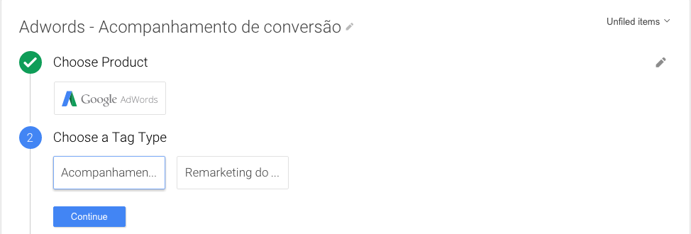 Após a configuração da tag escolheremos a opção acompanhamento de conversão e clicaremos em continue para dar segmento na implementação.