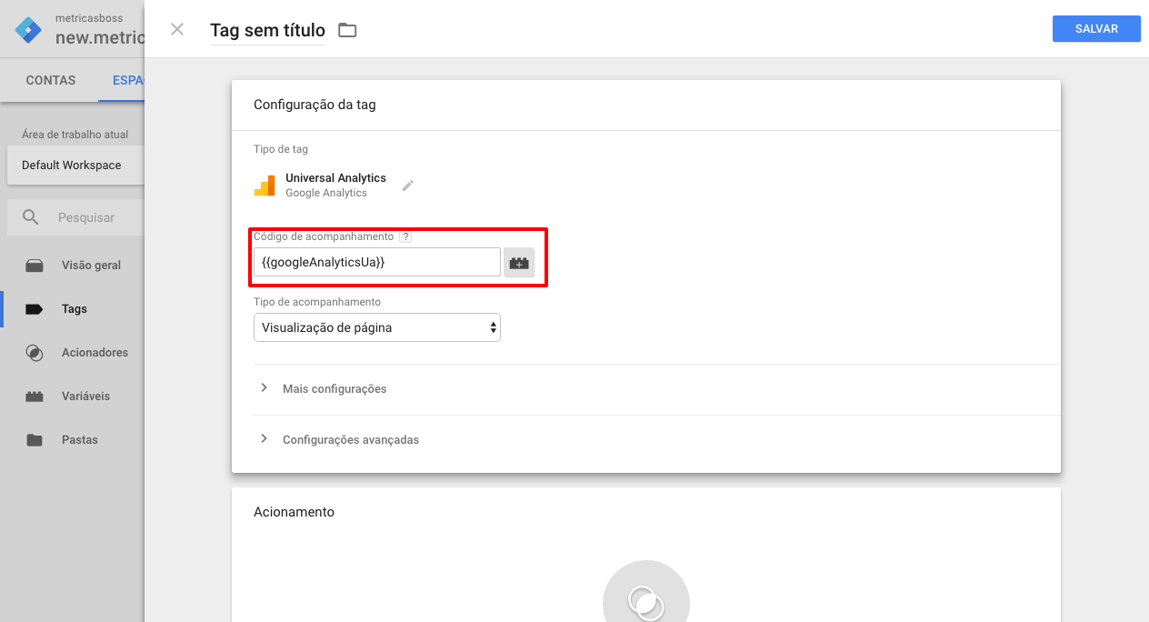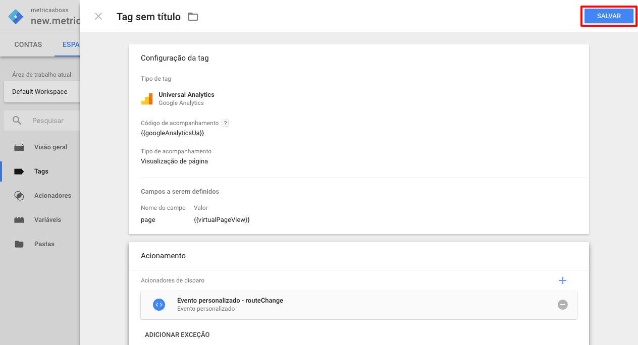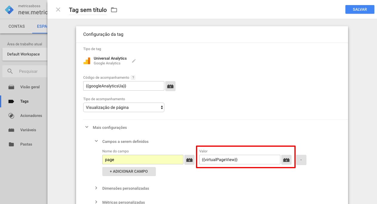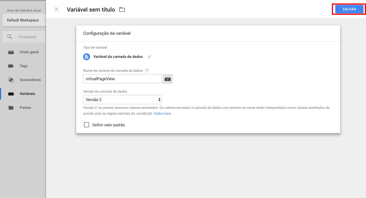 Adicione o “virtualPageView” no nome da variavel no google tag manager e clique em salvar;