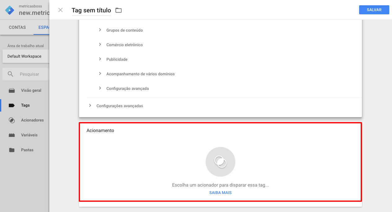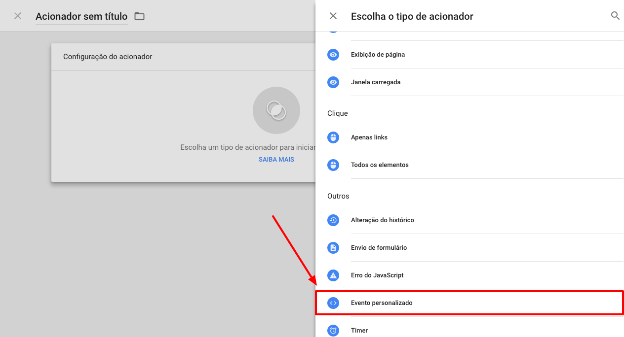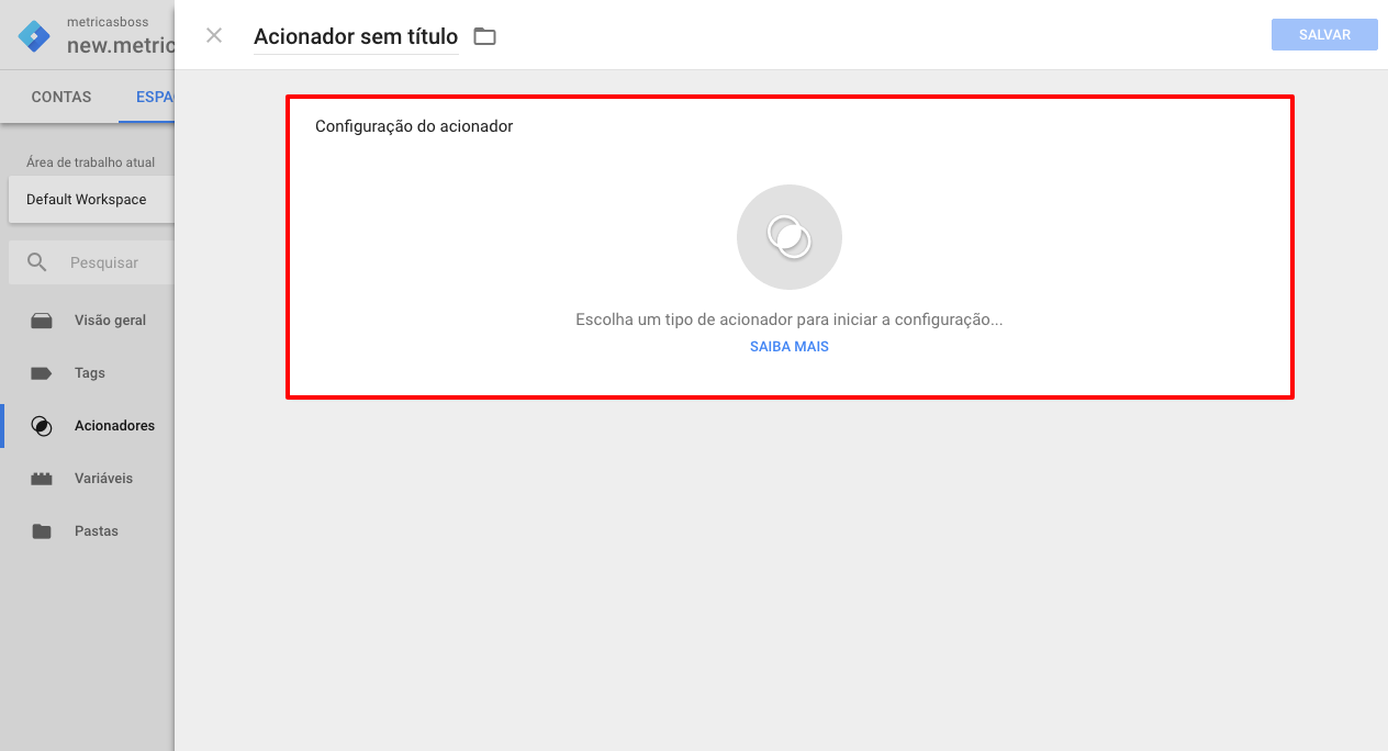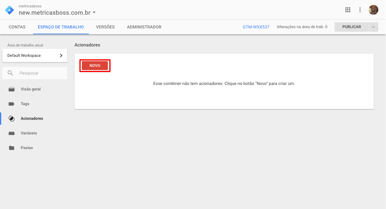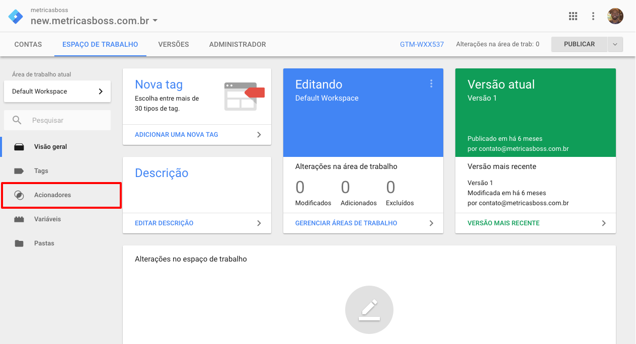 Abra seu google tag manager selecione seu container e clique no item “Acionadores” do menu lateral;