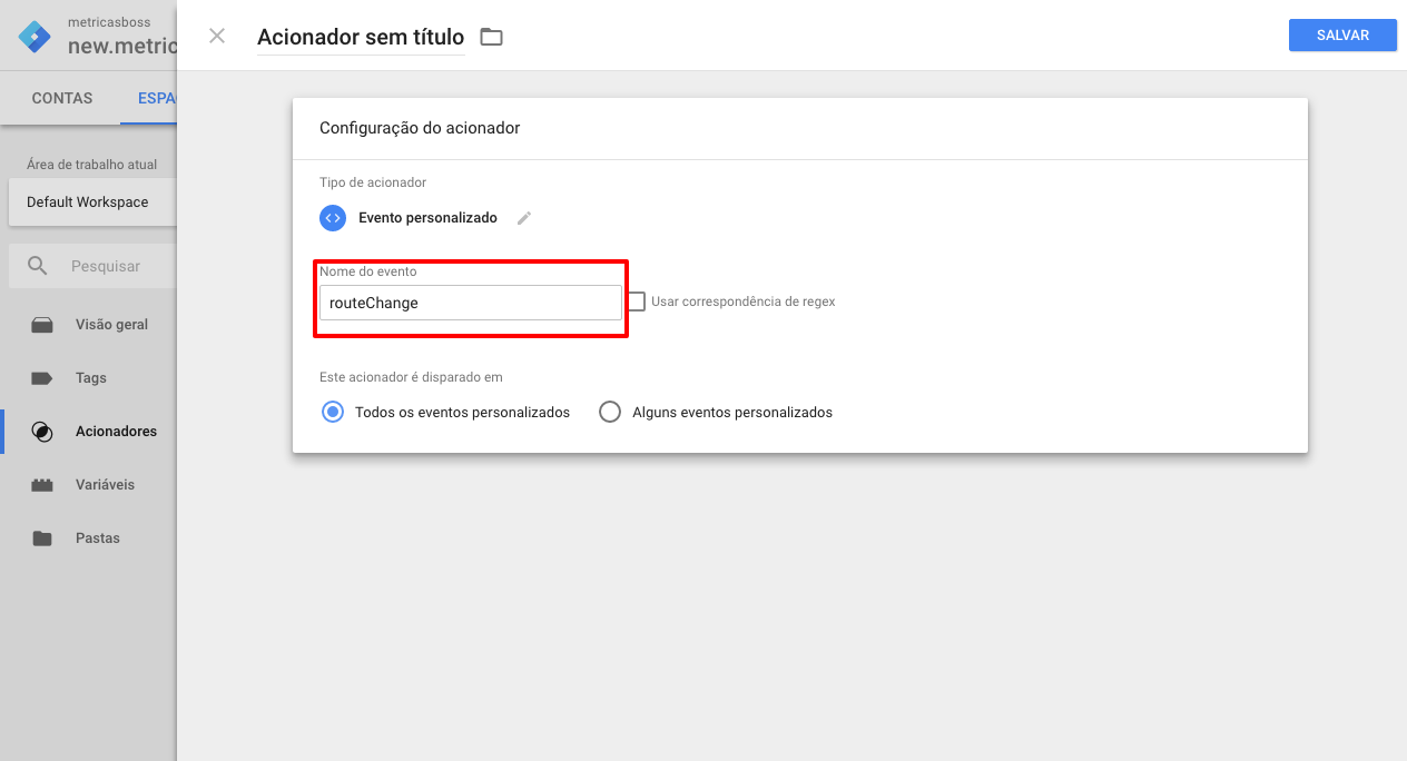 13 - Selecione o acionador personalizado que criamos “routeChange”;