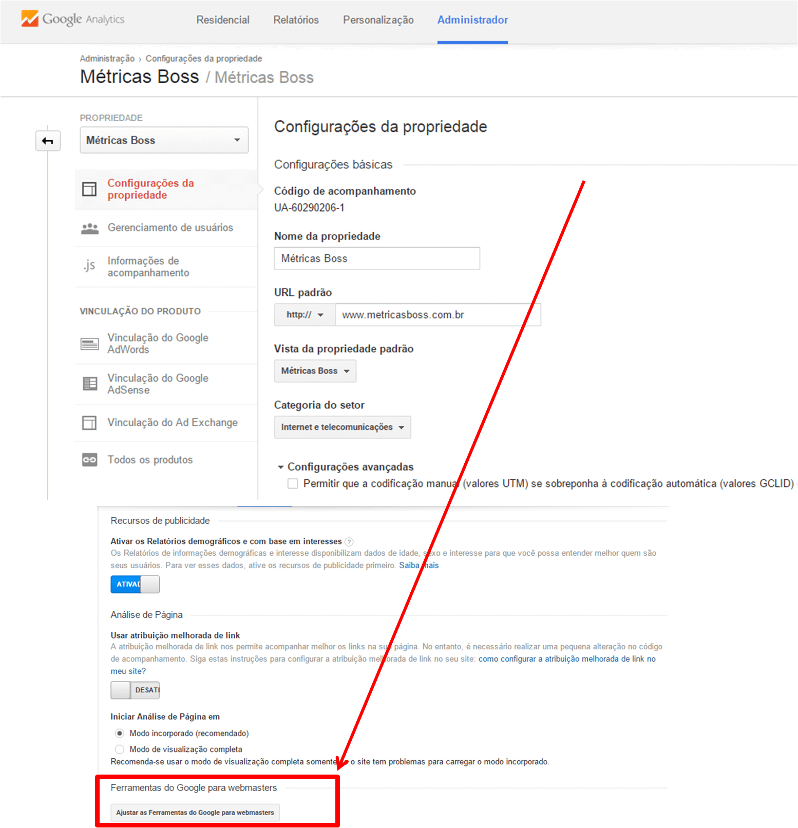Ao clicar nessa opção, o Google Analytics te levará para a tela de admin. Desça até o final da página para poder encontrar a opção “Ajustar as ferramentas do google para web masters”
