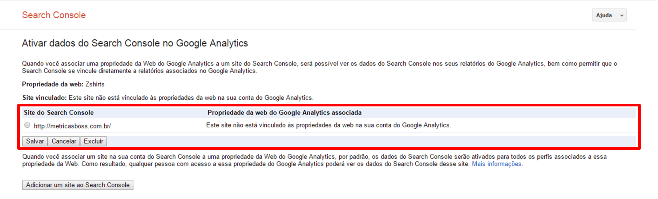 Ao clicar em editar você será direcionado para a parte de integração do Google Search Console onde selecionará a conta que deseja integrar ao Google Analytics