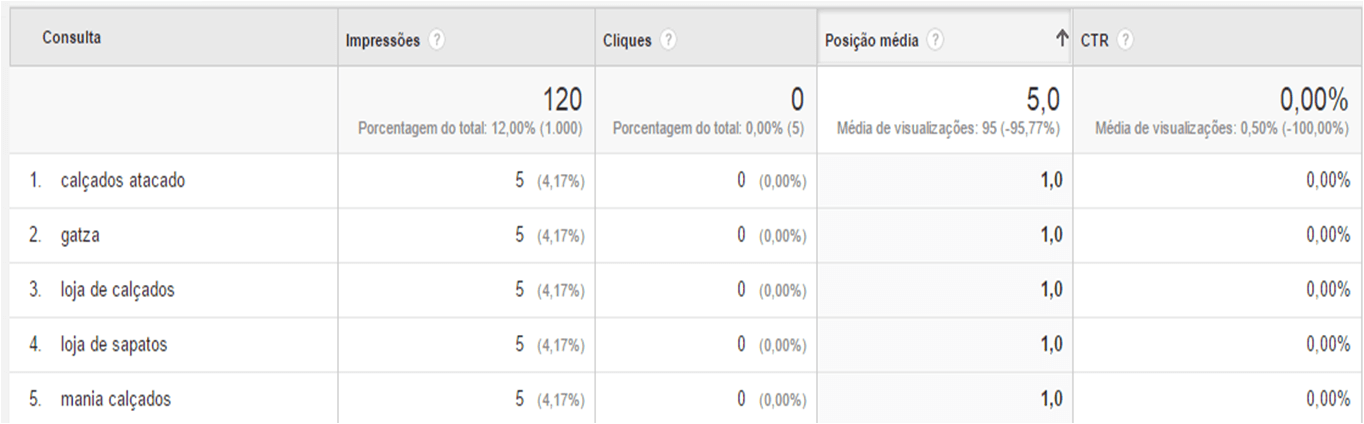 Você conseguirá analisar as principais palavras chaves que geram impressão e cliques para seu site e a posição dessas palavras: