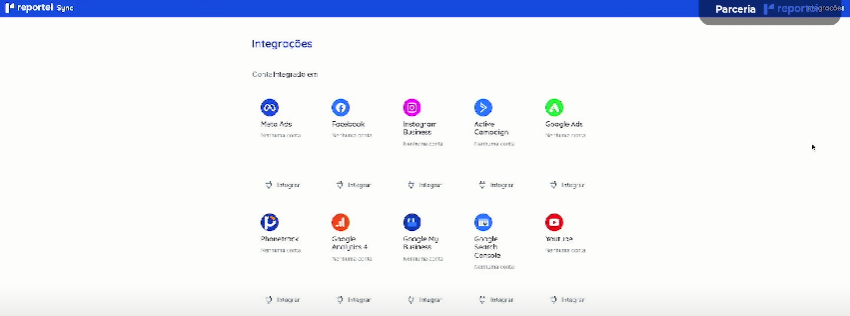Nessa guia, ele vai mostrar todas as integracões disponiveis, é possível extrair os principais indicadores de: Instagram, Facebook, Meta Ads, YouTube, TikTok, LinkedIn, Google Analytics, Google Ads, Mailchimp, Hotmart, RD Station, Active Campaign, PhoneTrack, Search Console, Google Meu Negócio, Twitter, Pinterest, Shopify, E-goi e outros canais.