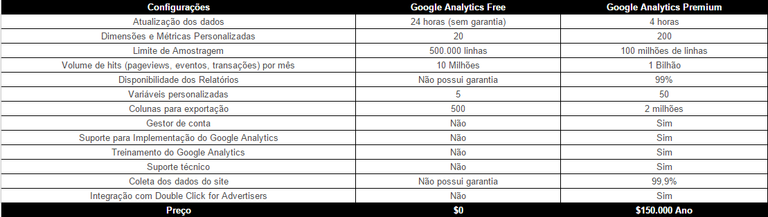 Além de ter essa SUPER vantagem, dando para você um poder de análise maior em relação ao seu negócio, veja no quadro abaixo as vantagens do Google Analytics Premium e também seu custo: