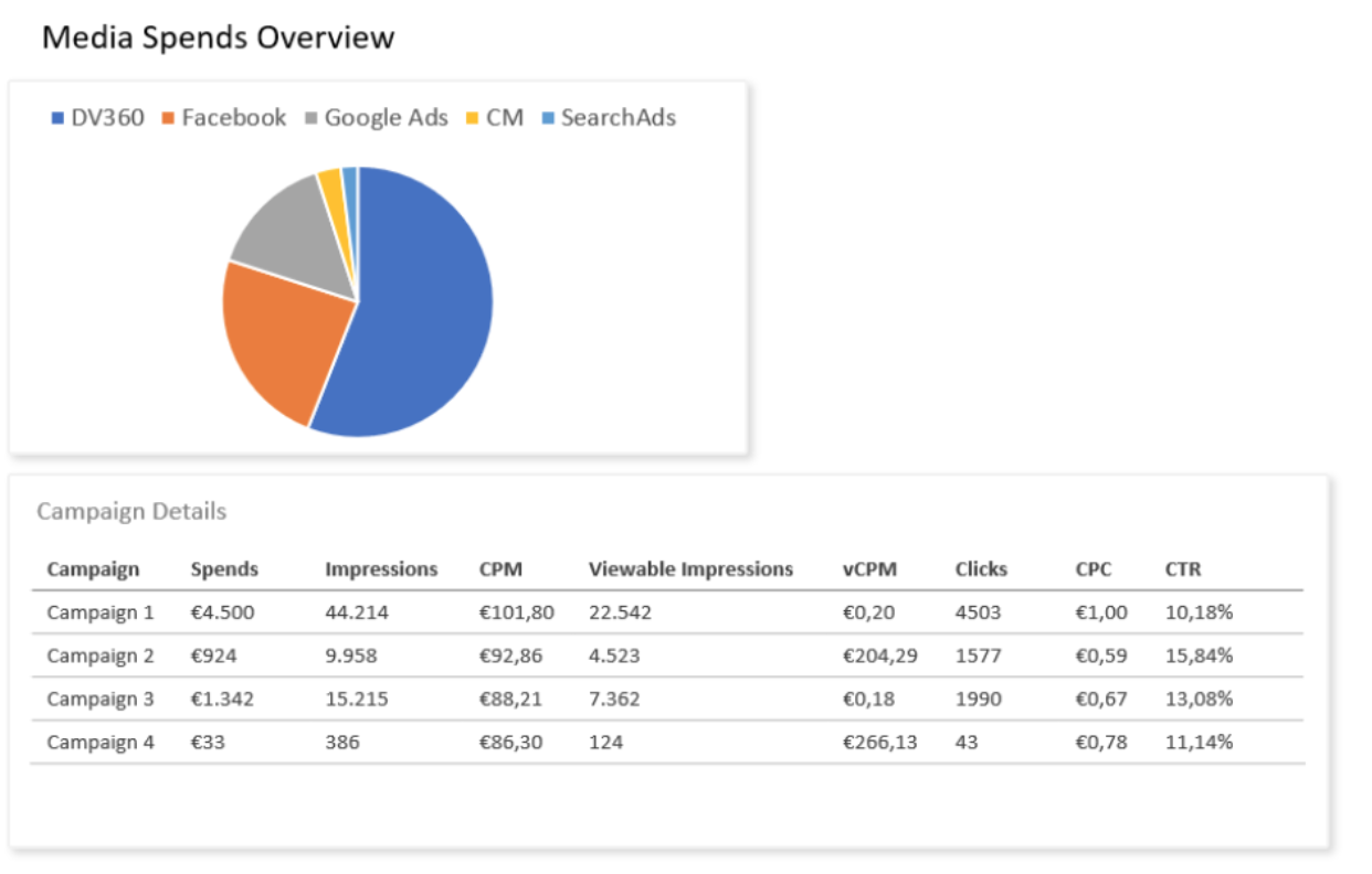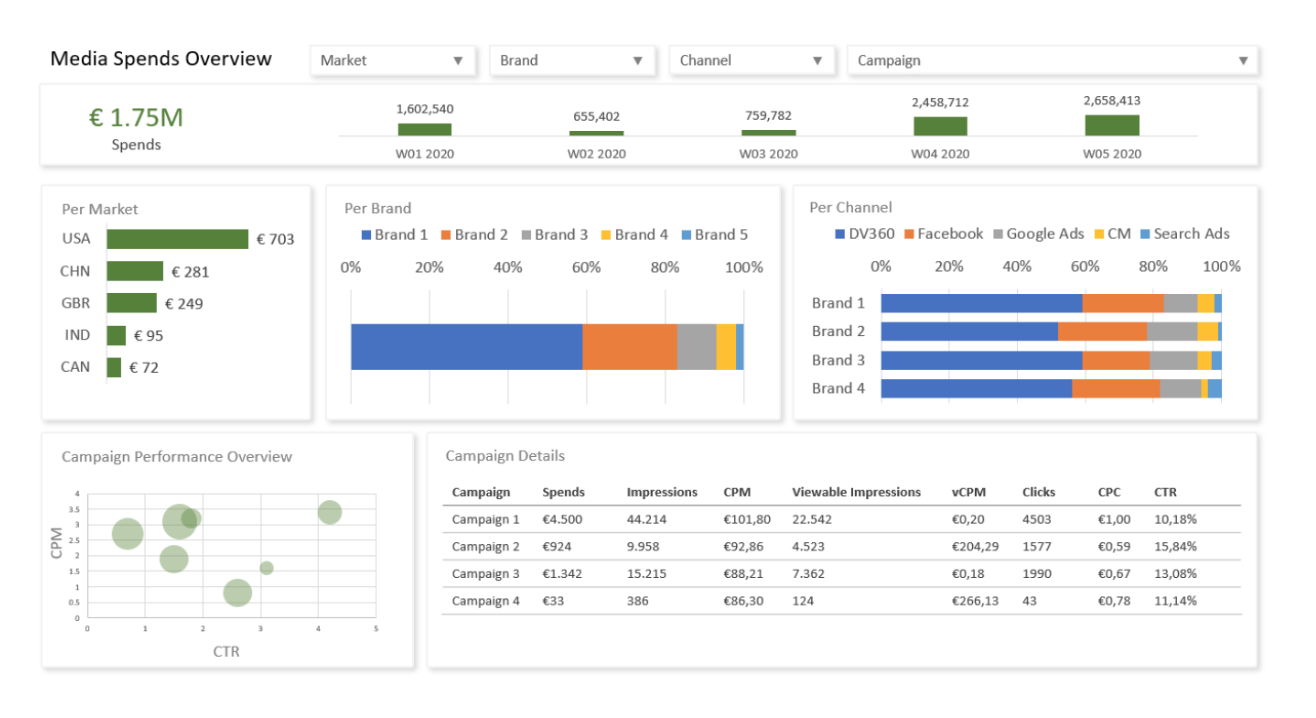 Por exemplo: a alocação de gastos em mídia era relevante apenas por canal ou também por marca? Na verdade, eles precisavam que esse dado por canal estivesse no nível da marca, então um gráfico de pizza não seria adequado (porque havia duas categorias para dividir os dados, canal e marca, e não apenas uma, como é nos gráficos de pizza). Os dados estavam se referindo a apenas um ou vários mercados? Precisávamos incluir uma classificação de gastos de mídia por país para saber o que priorizar. Com que frequência as pessoas tomariam decisões com base nos dados? Seria semanal, então decidimos adicionar uma visão semanal dos gastos.