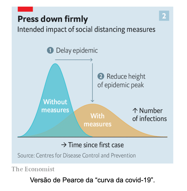 O gráfico da “curva da COVID-19”, que se tornou viral em 2020, foi criado pela jornalista de visualização de dados **Rosamund Pearce **para um artigo publicado pela revista The Economist, com dados dos Centros de Controle e Prevenção de Doenças, o principal instituto nacional de saúde pública dos Estados Unidos. Embora a percepção do comportamento pandêmico em ondas que podem ser representadas em um gráfico remonte ao início do século XX, na época da gripe espanhola, Pearce se inspirou em um artigo sobre prevenção de pandemias lançado em 2007 pelos Centros de Controle e Prevenção de Doenças dos EUA [1]. O gráfico de Pearce mostrava a importância de desacelerar a contaminação, para garantir que o sistema de saúde pudesse lidar com os casos ativos, enquanto vacinas e curas eram pesquisadas. Muitas versões do gráfico de Pearce foram compartilhadas nas redes sociais e ajudaram a aumentar a conscientização para combater a pandemia do coronavírus de 2020, incluindo uma versão animada brilhante criada por Alexander Radke, que ajudou a tornar o gráfico uma imagem viral.