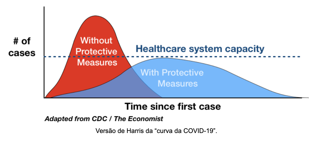 Um elemento-chave foi adicionado um dia depois: uma linha para representar a capacidade do sistema de saúde. Essa versão foi criada por Drew Harris, então professor assistente na Faculdade de Saúde Populacional da Universidade Thomas Jefferson, que viu a versão de Pearce na The Economist, e que já havia usado um gráfico semelhante inspirado no mesmo artigo do CDC em seu trabalho como instrutor de preparação para pandemias. Embora a posição da linha no eixo Y seja especulativa, ela deixou claro o impacto que as medidas de prevenção [2] poderiam ter. A ideia é simples: desacelerar a propagação da doença para que o sistema de saúde possa acompanhar todos os casos.
