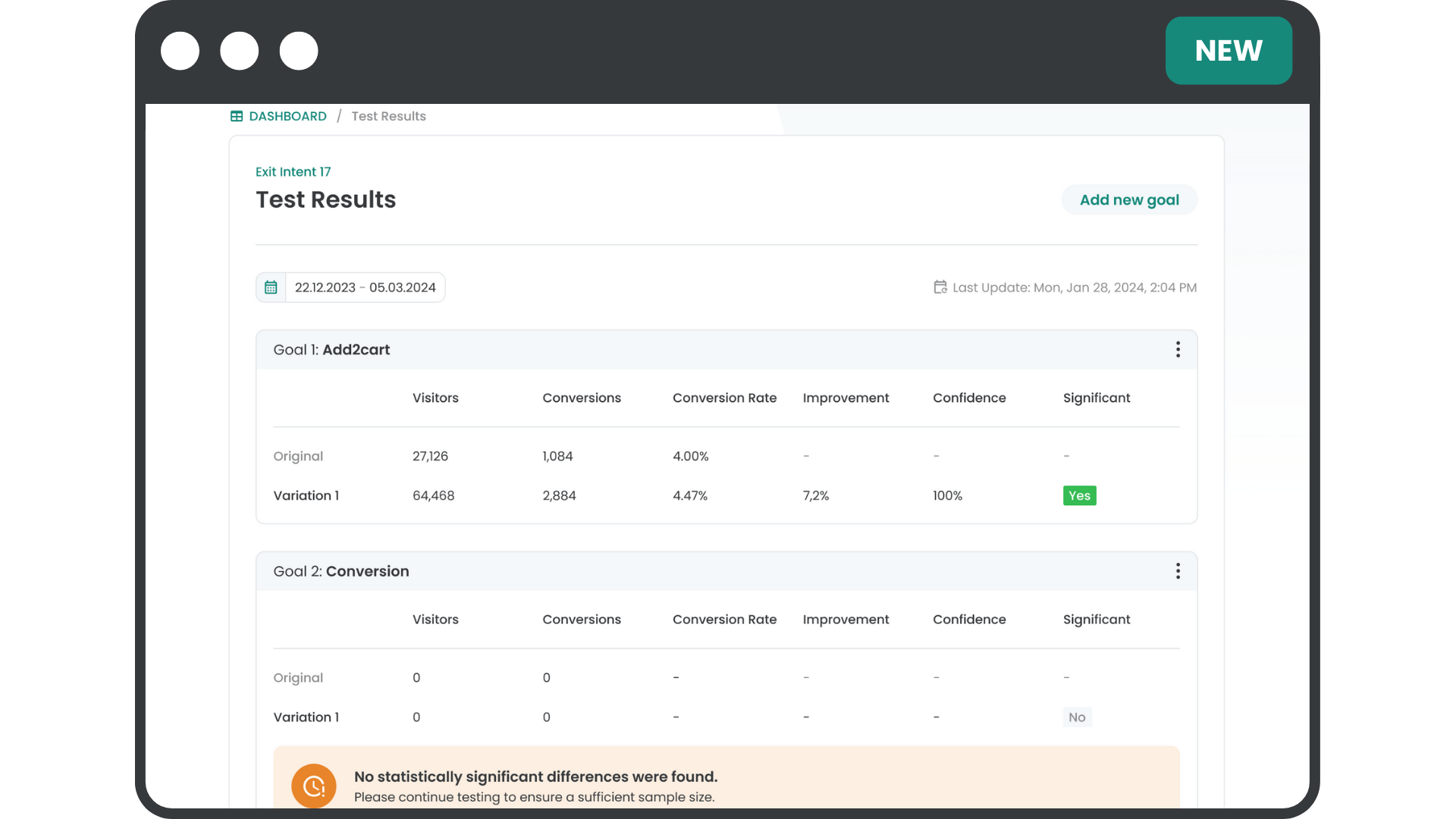 À medida que os visitantes recebem o controle ou a variação, seu envolvimento com cada experiência é medido e coletado em um painel e analisado por meio de um mecanismo estatístico. Você pode então determinar se a mudança da experiência teve um efeito positivo, negativo ou neutro no comportamento do visitante.
