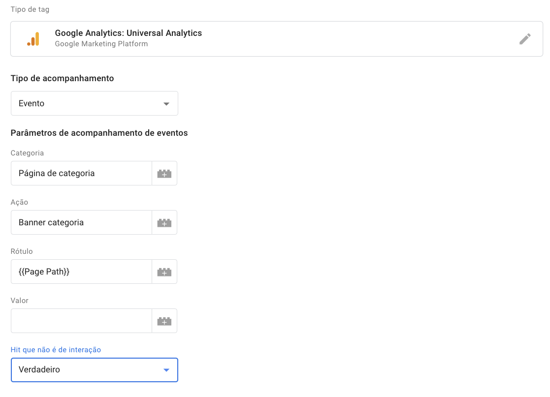 Ou seja, podemos passar todas essas informações de maneira estática diretamente em uma tag do Google Analytics de hit de Evento, ficaria mais ou menos assim: