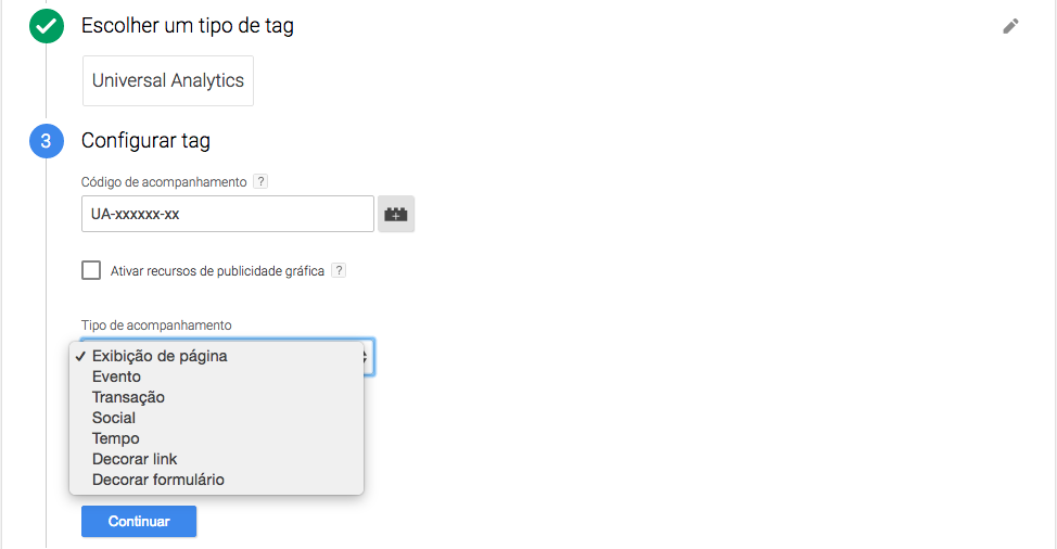 Esse passo é preciso um pouco de cuidado, para evitar possíveis incompatibilidades o tipo da tag tem que estar de acordo com a tag de page tracking do seu site. Mas qual é a diferença de uma pra outra, de maneira bem rápida a tag de conversão clássica não tem suporte a alguns serviços disponibilizados nessa nova versão da tag. Por exemplo a sincronização off-line dos dados a customização das dimensões e métricas, além dessa nova versão a universal ser multi-plataforma.