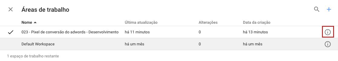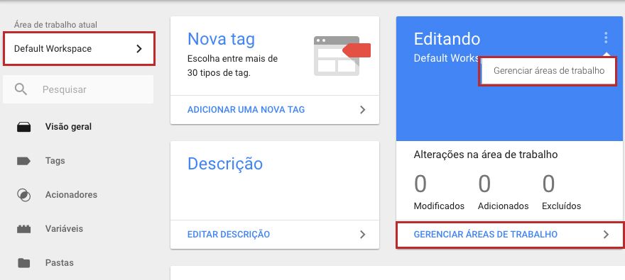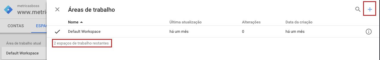 Percebeu um alerta no canto inferior direito? Então minha gente, como eu havia falado o GTM entrou de vez no Enterprise game e com isso a versão free limita a criação de workspaces para 3 apenas. Mas vamos voltar ao nosso workspace.
