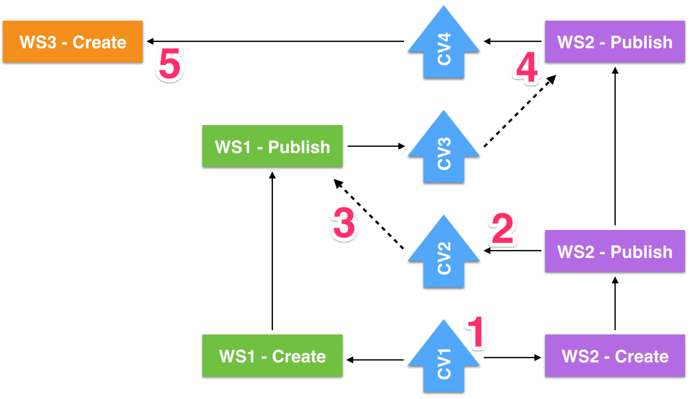 - •O WS1 foi baseado no CV1 correto? Só que agora o novo container foi substituído pelo CV2, WS1 recebe uma notificação de que a mais recente versão do contêiner mudou e uma sincronização é necessária. WS1 é atualizado e não tendo conflitos ele segue normalmente a sincronização. Em seguida, o WS1 é publicado e passa a ser um novo Container versão 3 (CV3);