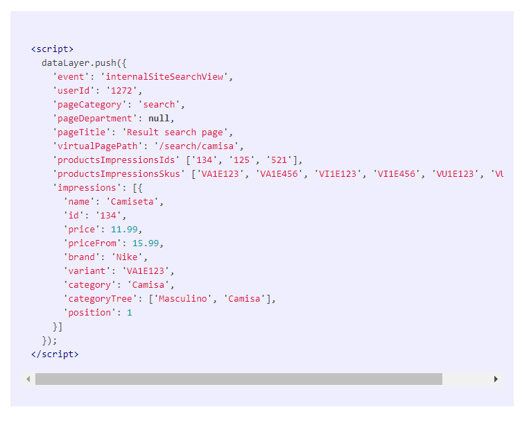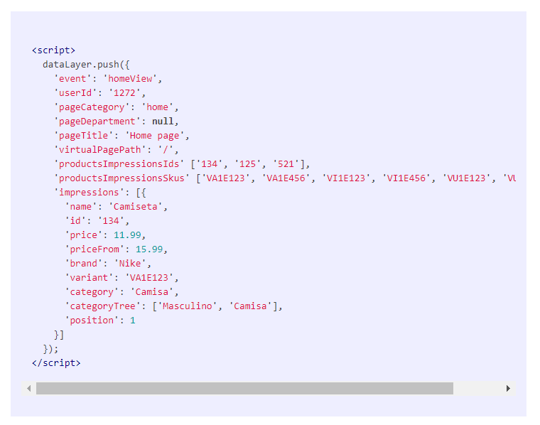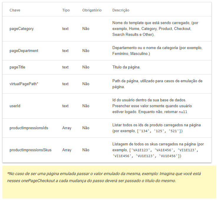 Informações que serão disparadas nas páginas de produto