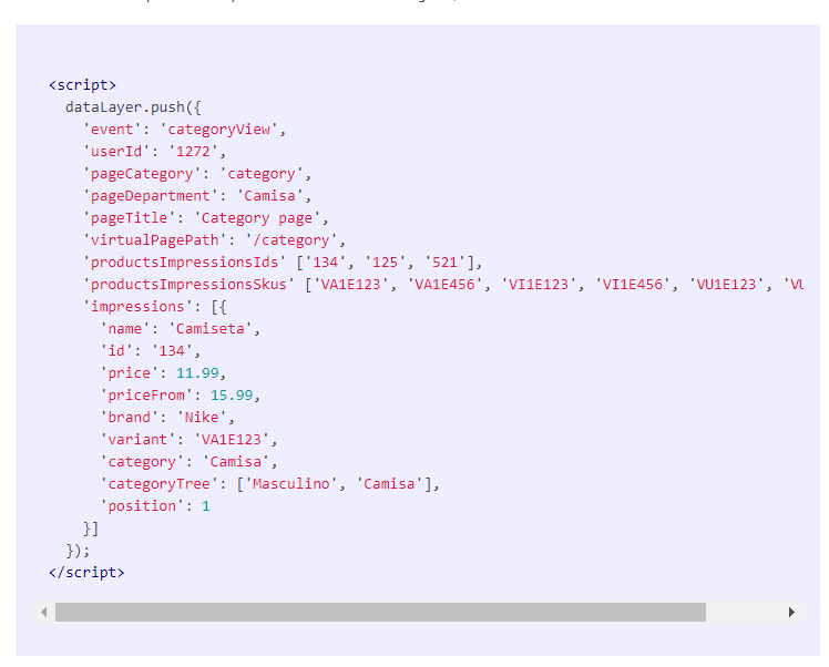 Informações que serão disparadas nas páginas de categoria