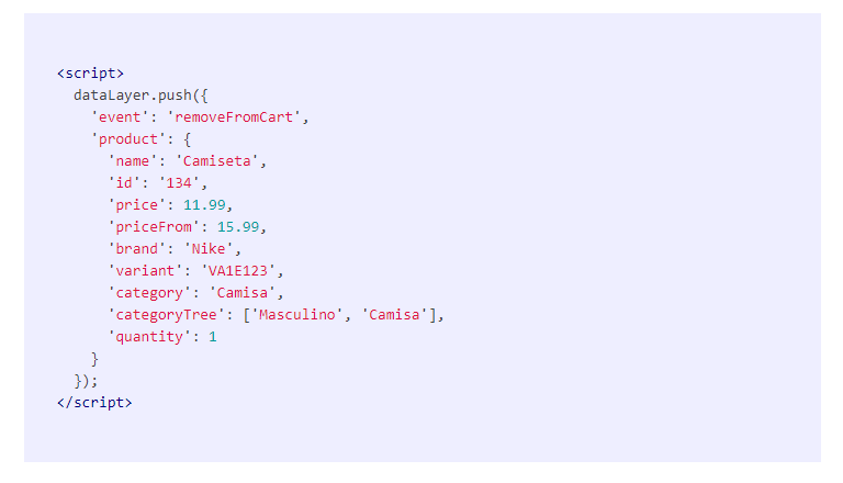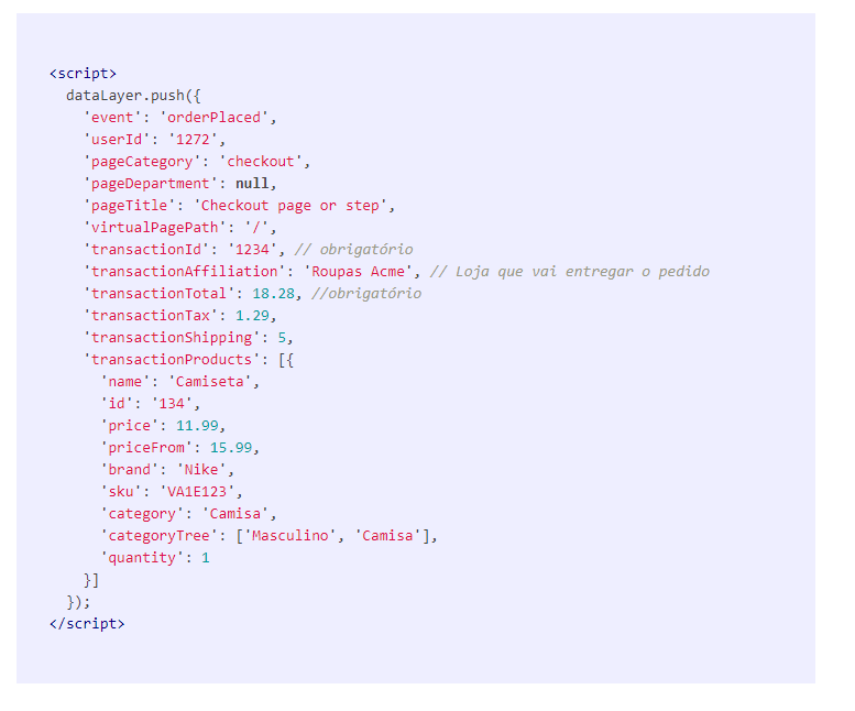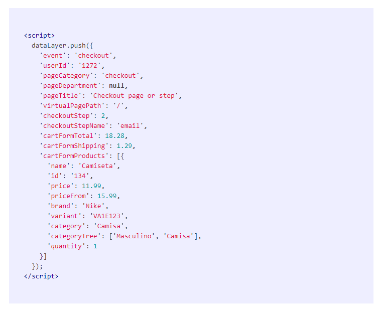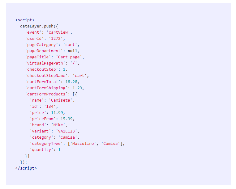 Informações que serão disparadas na página de carrinho