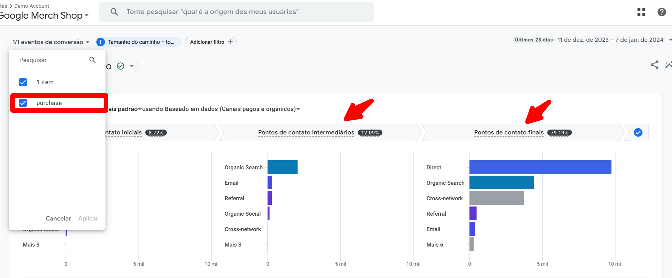 Aqui está um exemplo em que seleciono apenas a conversão de ‘compra’.