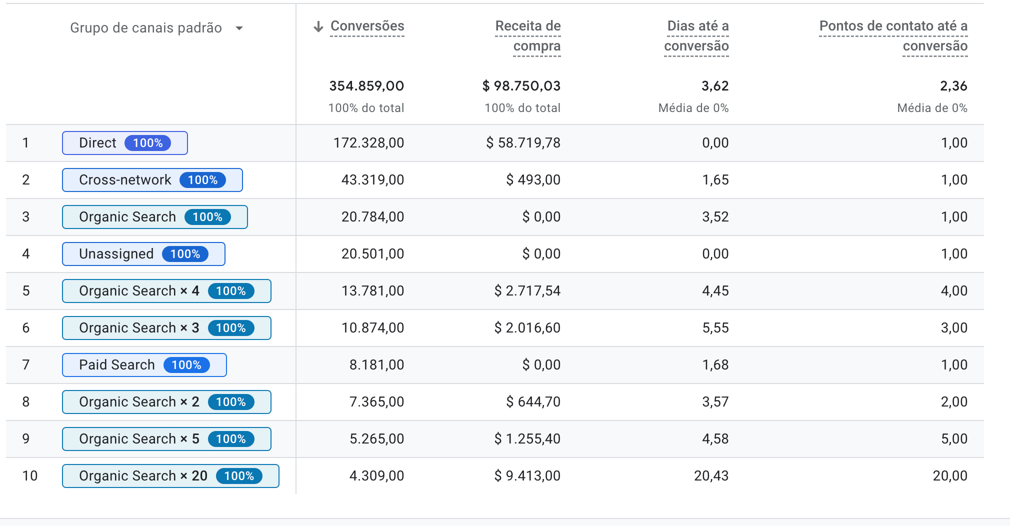 O exemplo acima (linha 45) mostra que 3% de todas as conversões/crédito de conversão são atribuídos a um ponto de contato entre cross-network e os outros 97% aos dezenove pontos de contato do google / organic.