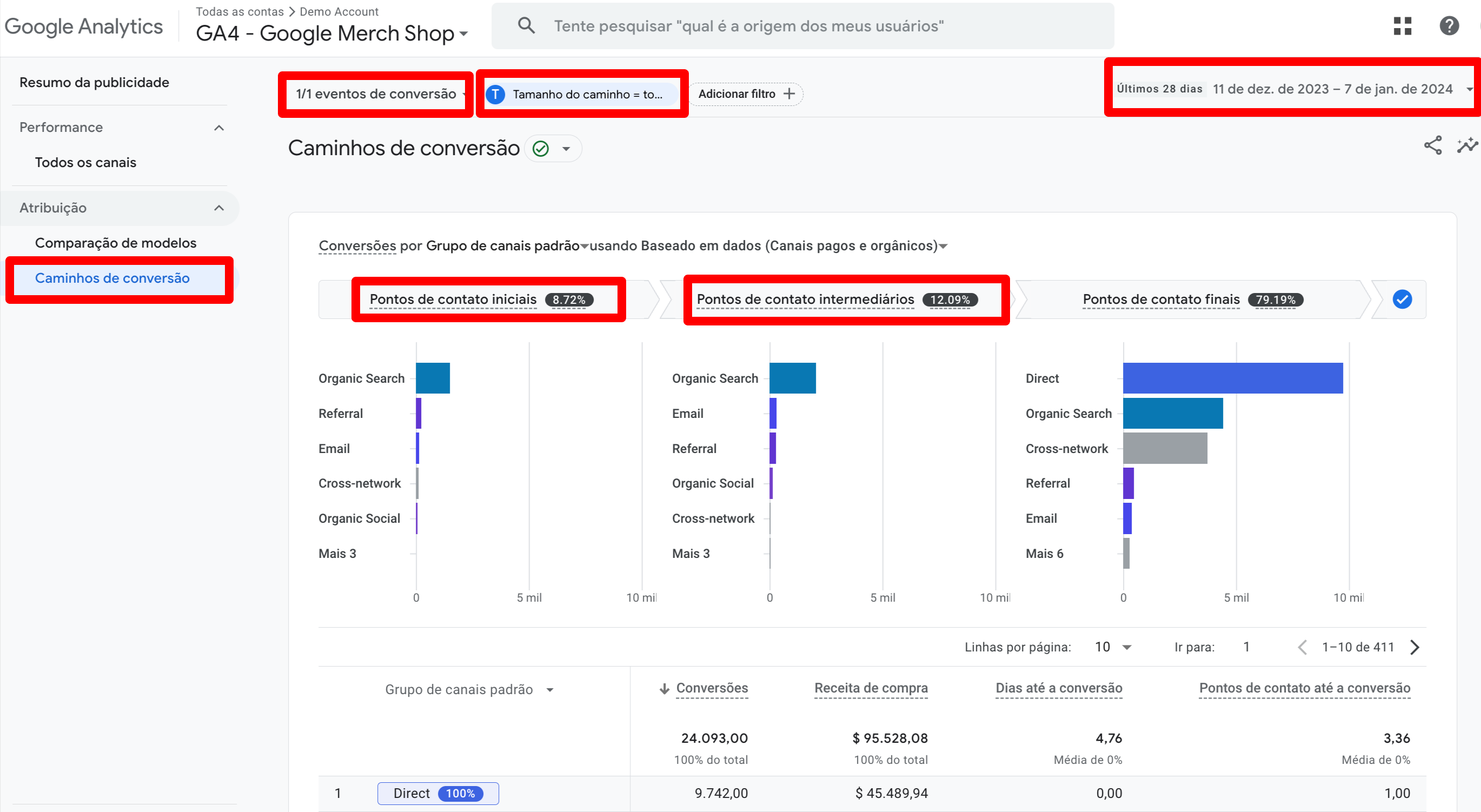 A análise é feita com base no modelo de atribuição Data-Driven.