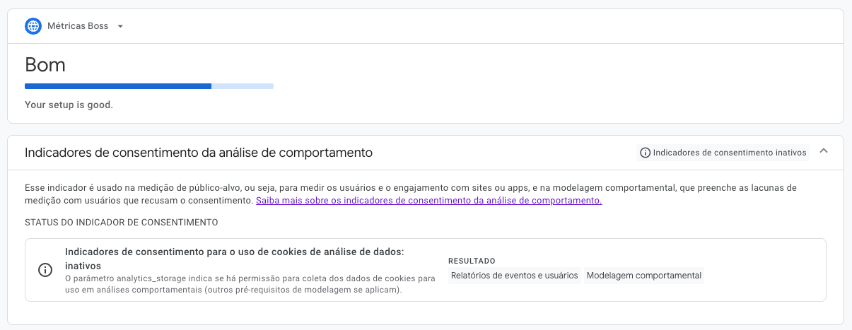 A nova interface apresenta indicadores visuais claros que mostram o status da sua implementação. Quando você acessar as configurações de consentimento, verá um status "Bom" com "Your setup is good" quando tudo estiver funcionando corretamente, ou alertas específicos quando houver problemas detectados.