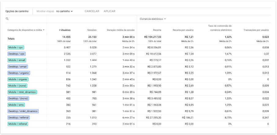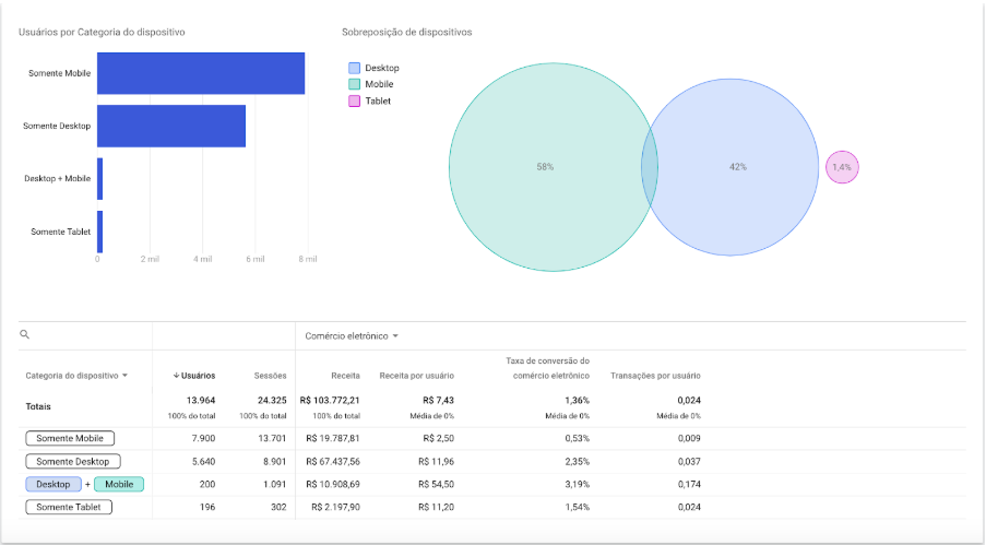 No relatório é possível ver também os KPI’s de conversão, logo ele mostra pra gente qual a Receita gerada pelos diferentes dispositivos e pelas diferentes combinações de dispositivo, assim como também a Taxa de Conversão e a quantidade de Transações.