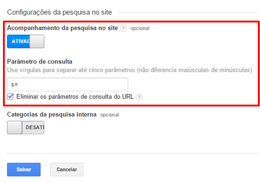 Dentro da vista de propriedade, selecione a opção “acompanhamento da pesquisa no site” e informe o parâmetro de busca do seu site. Para saber qual é o parâmetro de busca, basta você efetuar uma busca no seu site e analisar qual o parâmetro que esta na URL antes do termo que você digitou, no caso do nosso site é o parâmetro “s=”, conforme a imagem abaixo