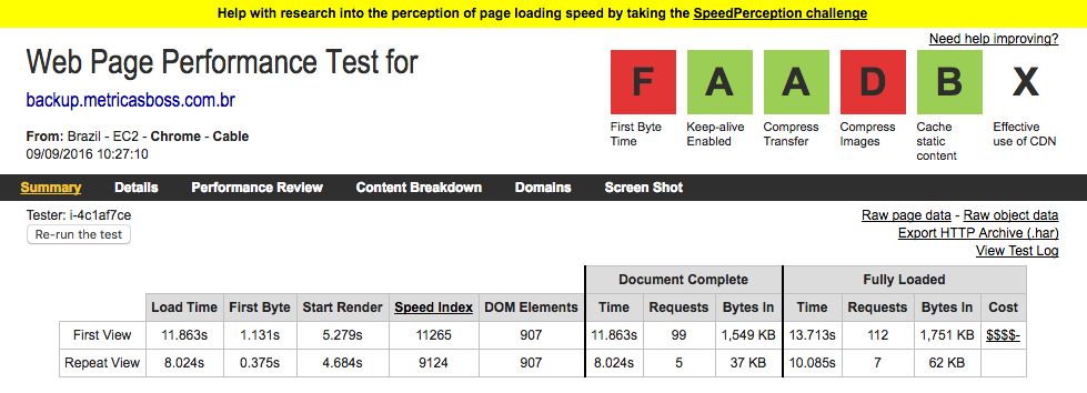 primeiro passo para se melhorar o seu TTFB é mensurar e foi o que fizemos, uma excelente ferramenta que utilizamos para mensurar performance como um todo é o webpagetest.org.