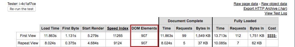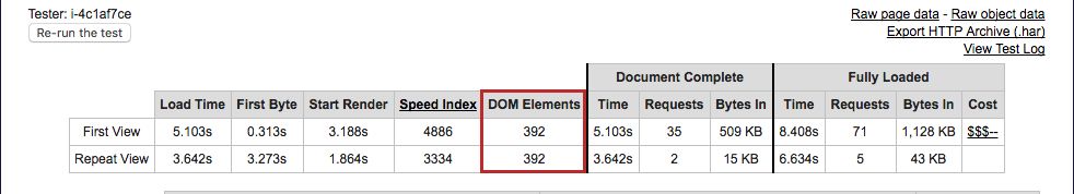 E não foi só em número de requisições que a nossa re-estruturação de código nos trouxe benefícios, ganhamos muito em quantidade de elementos no DOM com essa re-fatoração, veja a diferença: