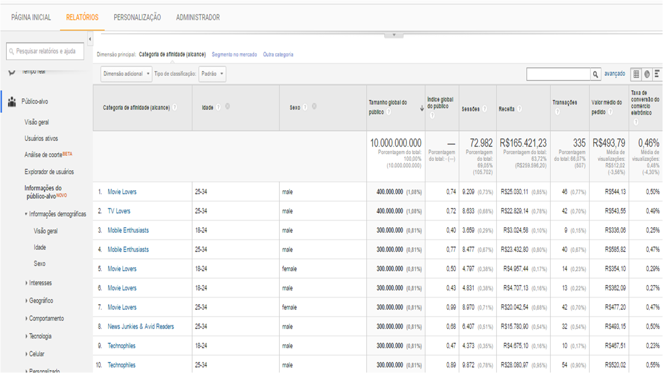 Esse relatório ainda não esta disponível em todas as contas do GA, porém ele é um relatório que soma os dados de interesse, idade, sexo e categoria de compra dos usuários que acessaram o seu site e com isso é possível entender ainda mais sobre o seu público.