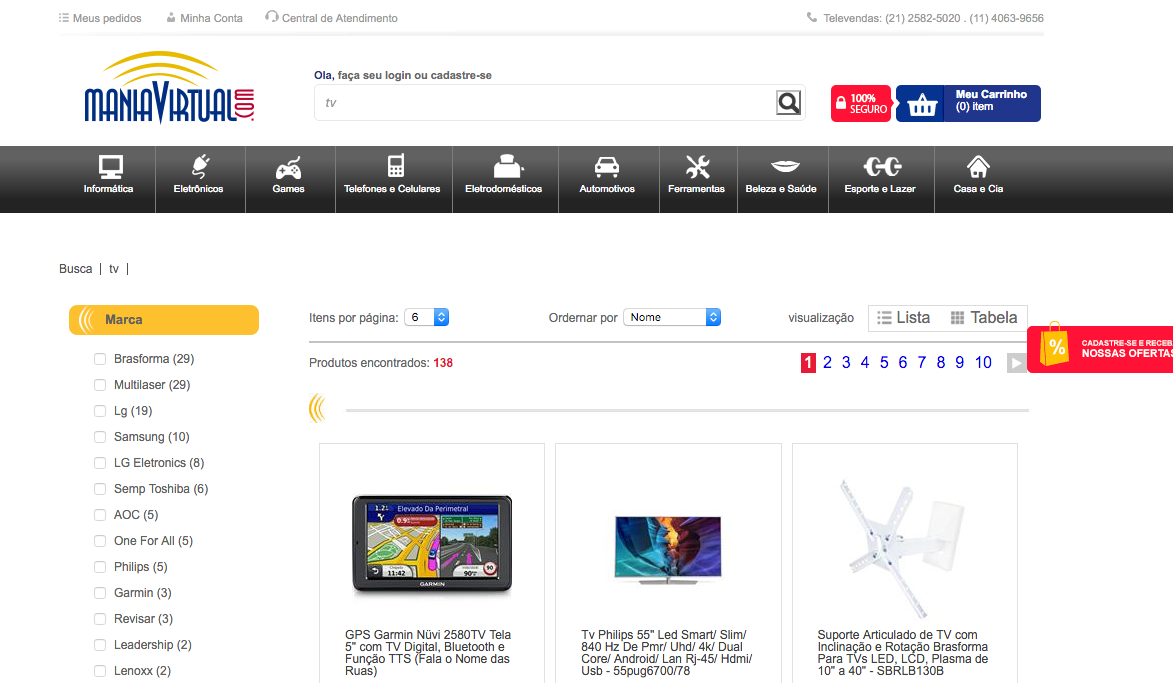 🔹 Fizemos a busca por “tv” e o site retornou 138 resultados que possuem TV e todos fazem sentido.