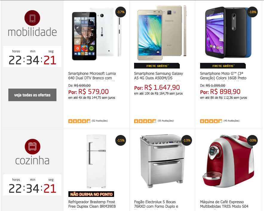 Outra segmentação muito inteligente é a que fazem na própria home, dividindo os produtos exibidos na vitrine por categorias, ou seja, os usuários tendem a acreditar que aqueles são os melhore produtos ou os produtos com os melhores preços na categoria: